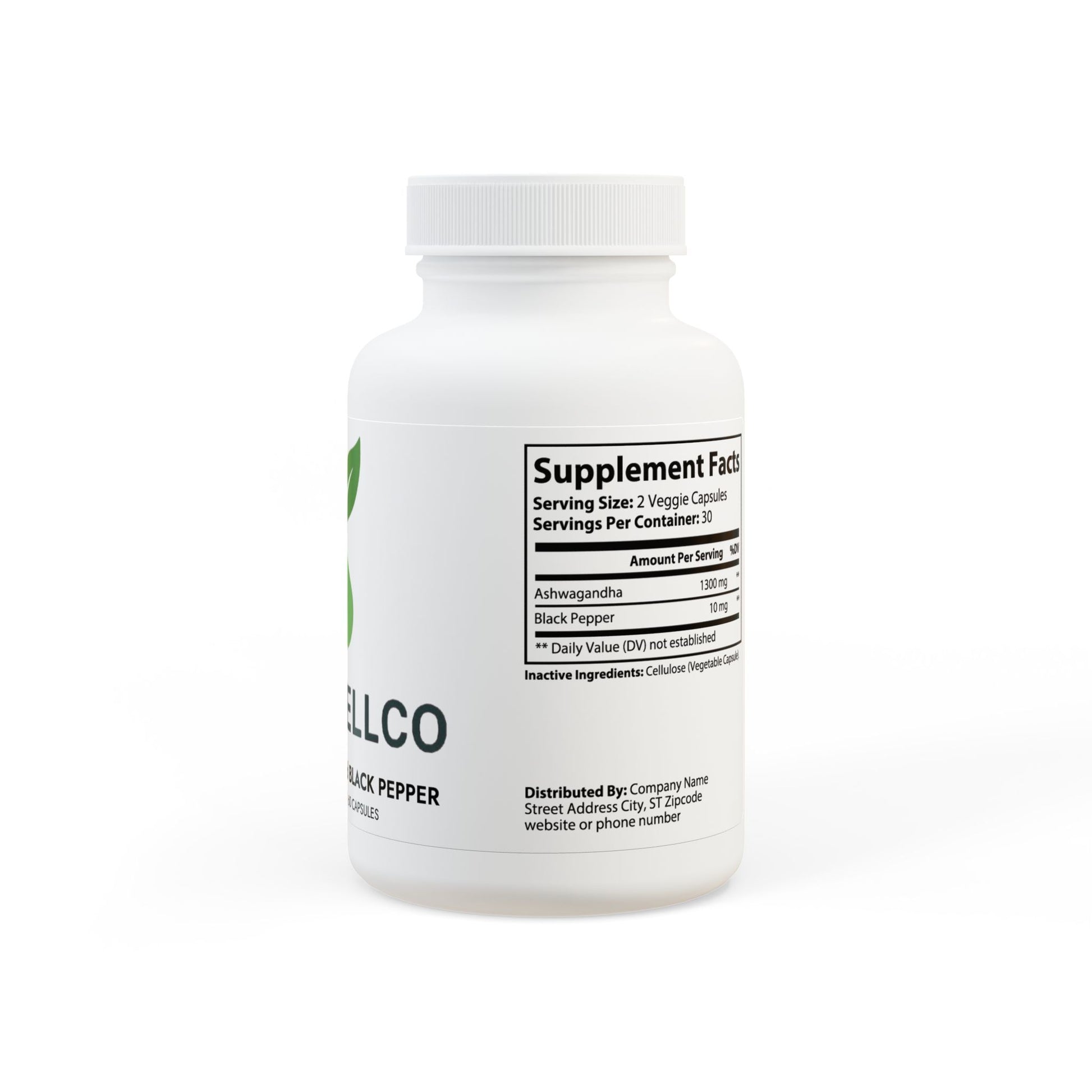 Ingredients: Ashwagandha, Black Pepper. Inactive Ingredients: Cellulose (Vegetable Capsule).